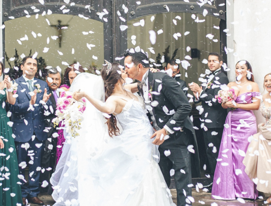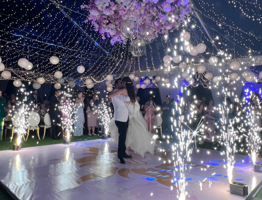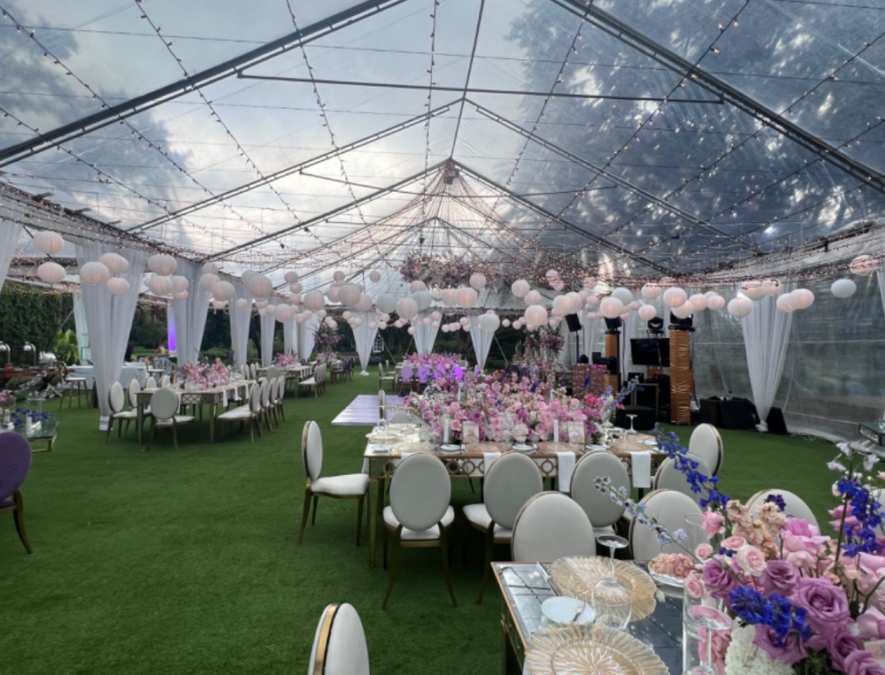 Think flowers are just for your tables? Think again. Suspending lush arrangements a few feet above your guests’ dinner plates is a fun way to create a more intimate space. (This tip is especially handy if you’re not so fond of your venue’s carpeting—just keep people looking up!)